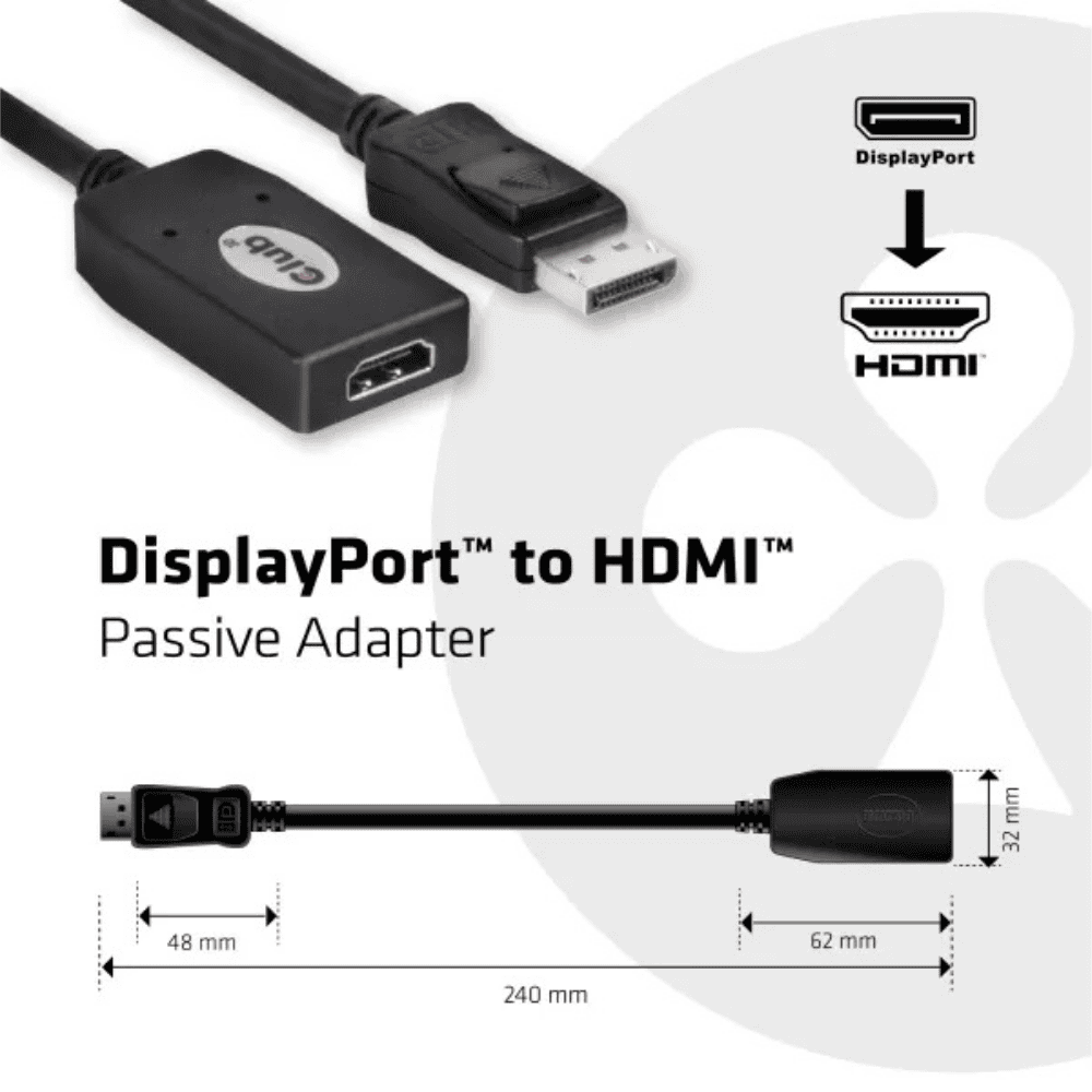 Club 3D CAC‑1001 adapter forbinder din PC's DisplayPort til en HDMI-skærm eller projektor – uden brug af driver. Passer både til kontorbrug og hjemmearrangementer.